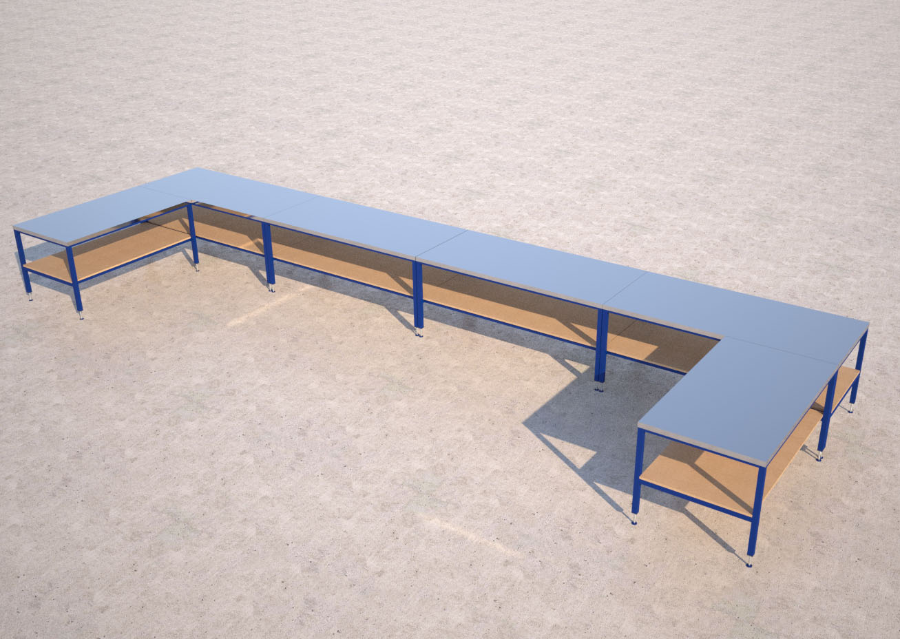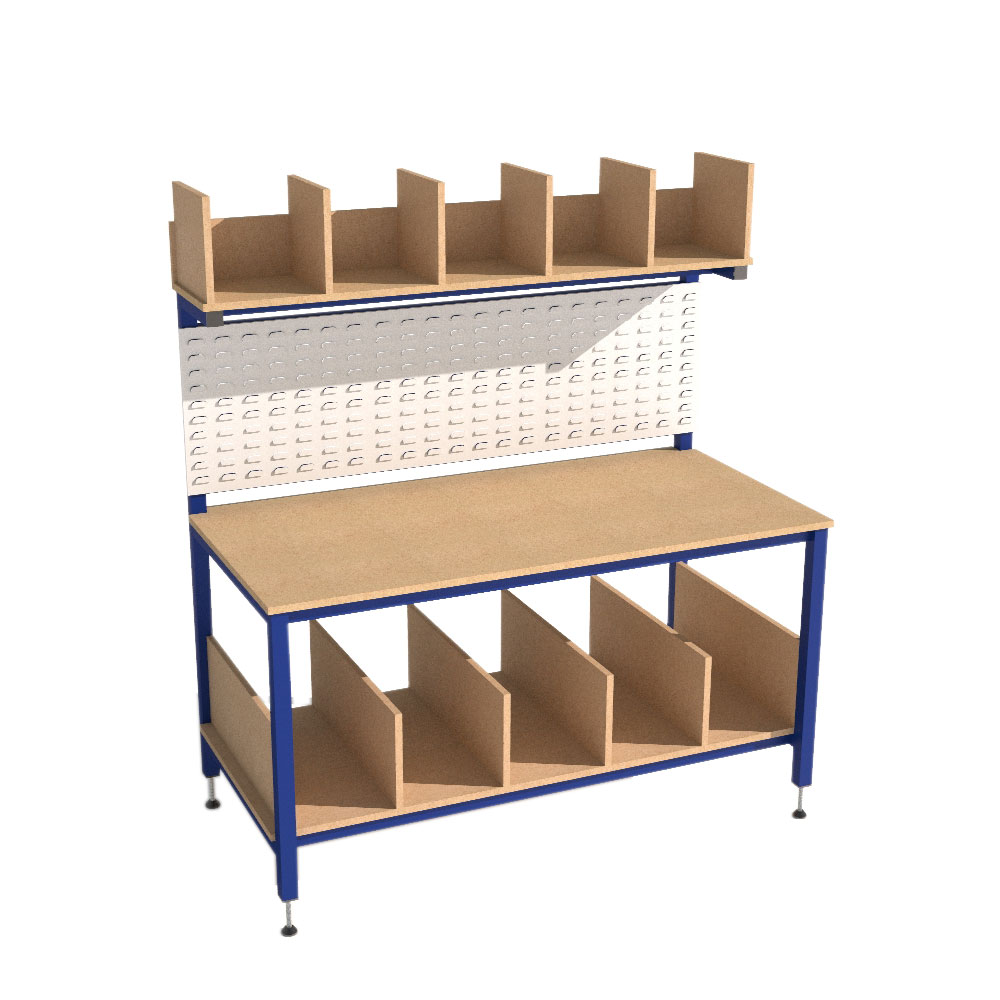 Construction | Welded box section framework powder coated in blue (RAL5010) MDF worktop MDF shelves MDF dividers |
